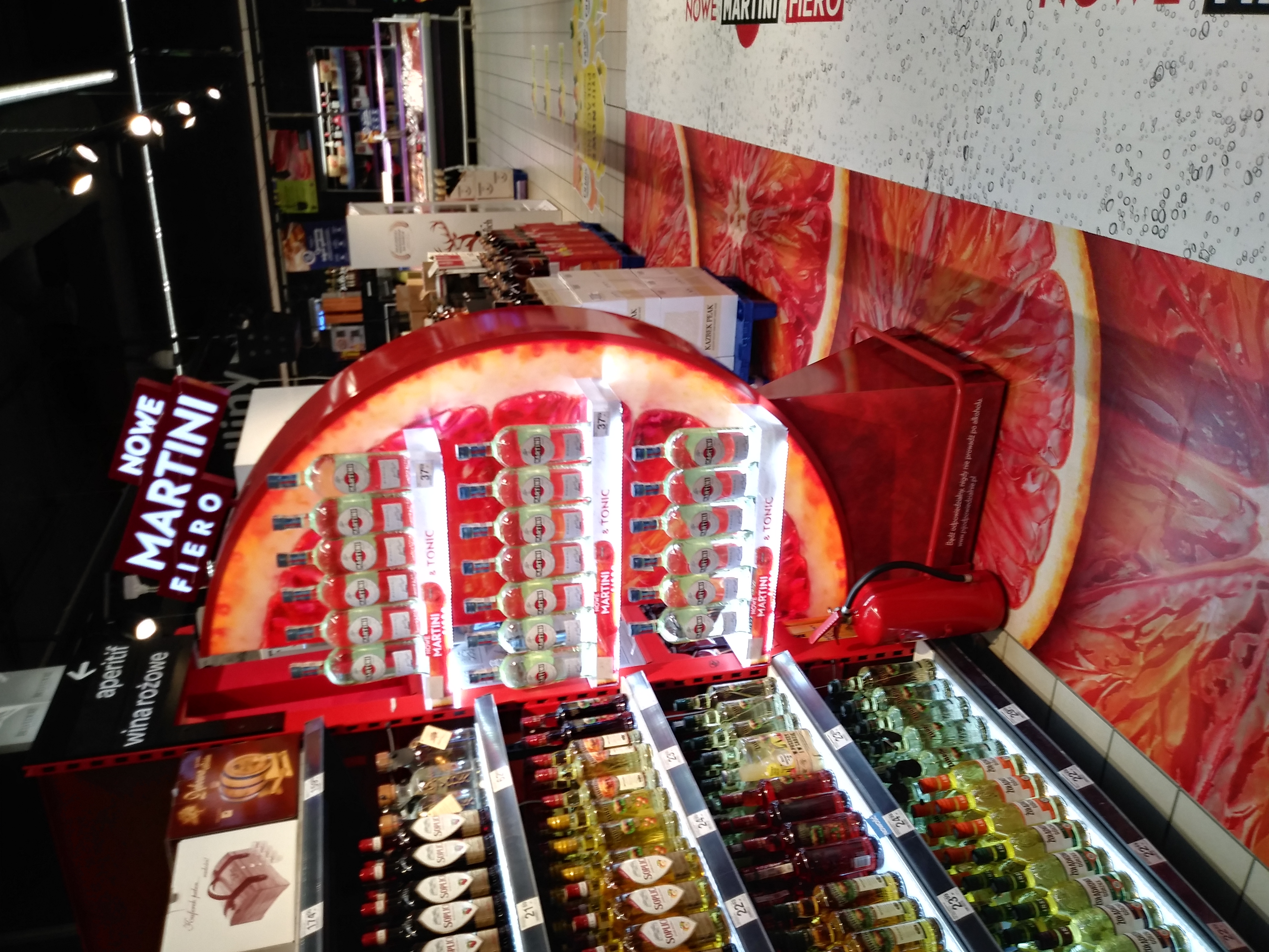 Wysokiej klasy stojak podłogowy, podświetlany, w kształcie plastra czerwonej pomarańczy, nawiązuje do składnika produktu, który buduje jego specyficzny kolor i smak. Dodatkowo floor sticker z powtórzeniem właśnie tego owocowego dodatku, buduje świetną zauważalność ekspozycji i wspiera koncentrację kupujących na marce, ze szczególnym naciskiem na najnowszy produkt.